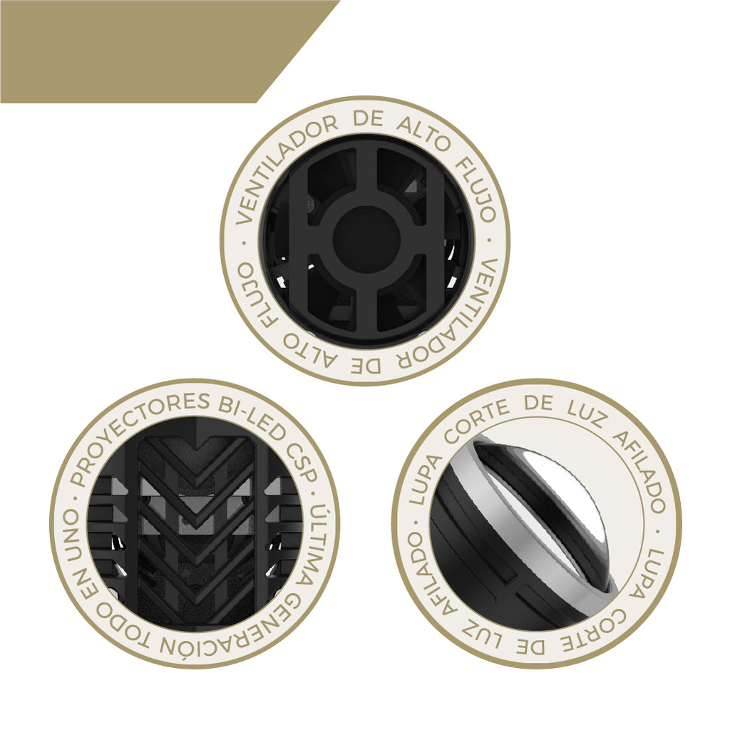 Su estructura de aluminio con difusor y ventilador garantiza la temperatura óptima para la durabilidad del LED, cuenta con driver externo y conector original para facilitar su instalación, en algunos autos es necesario retirar el capuchón del faro, para poder instalar este proyector, este se retira quitando un tornillo que sujeta esta pieza y sale por el mismo faro, finalmente se deberá alinear el proyector ajustando la altura deseada para una optima proyección de luz.